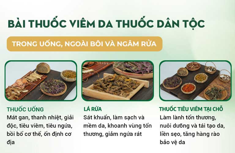 Bài thuốc chữa viêm da Thuốc Dân Tộc có sự kết hợp chặt chẽ 3 nhóm thuốc gồm UỐNG, TIÊU VIÊM TẠI CHỖ, LÁ RỬA mang đến phác đồ điều trị hoàn chỉnh.