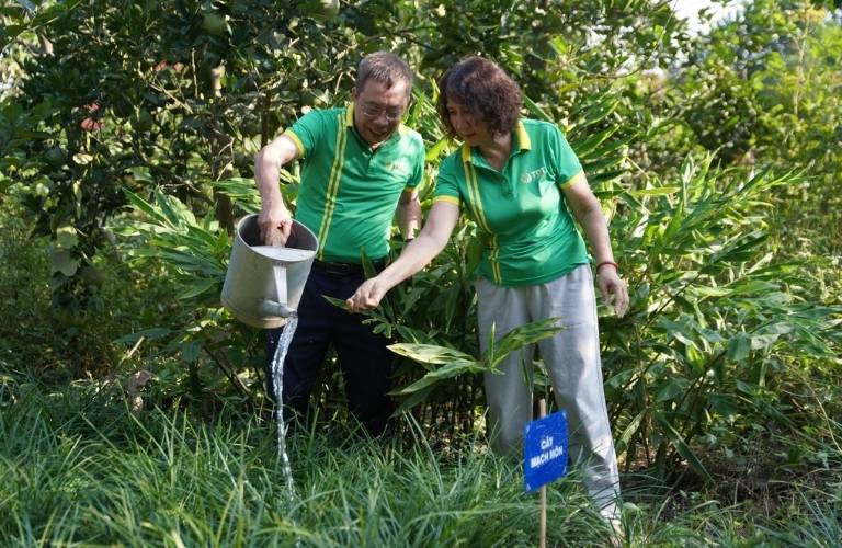 Sau lễ trao tặng, đoàn tiếp tục di chuyển đến vườn thuốc Nam thôn Vật Yên – nơi được mệnh danh là “kho báu thảo dược của Ba Vì”. Dưới chân dãy Tản Viên hùng vĩ, từng cây thuốc được trồng xuống đất trong sự háo hức và xúc động của mọi người.